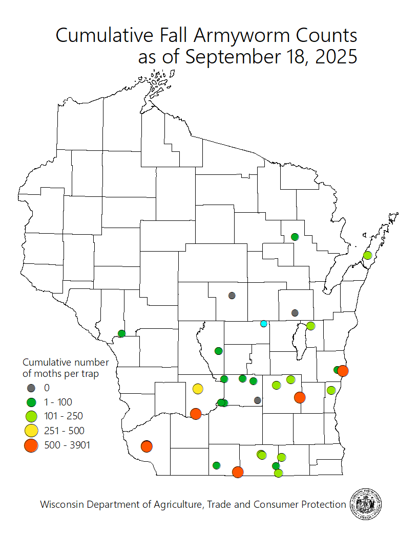 Pheromone traps have been established at sites throughout Wisconsin to monitor late-season flights of fall armyworm moths. Counts from the trapping survey provide data on the timing of local moth flights and may be useful for planning field scouting activities. The results of the survey are presented below and will be updated weekly from late July through mid-September.