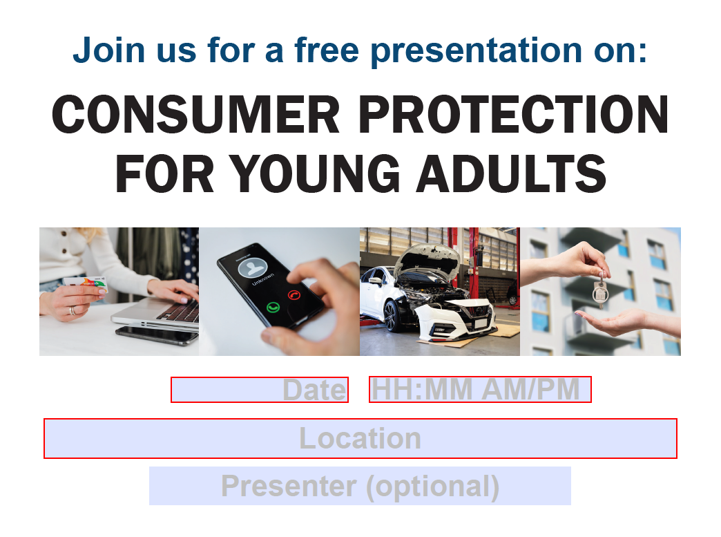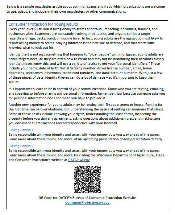 Use this sample article for your organization's next newsletter. It can be copied or adapted to keep your audience informed about Consumer Protection for Young Adults. Read the article text below and download the newsletter article.