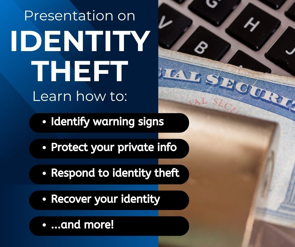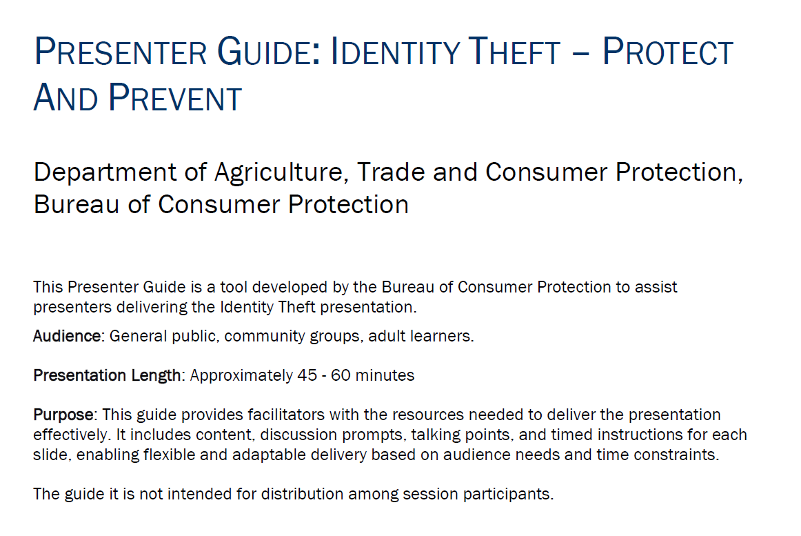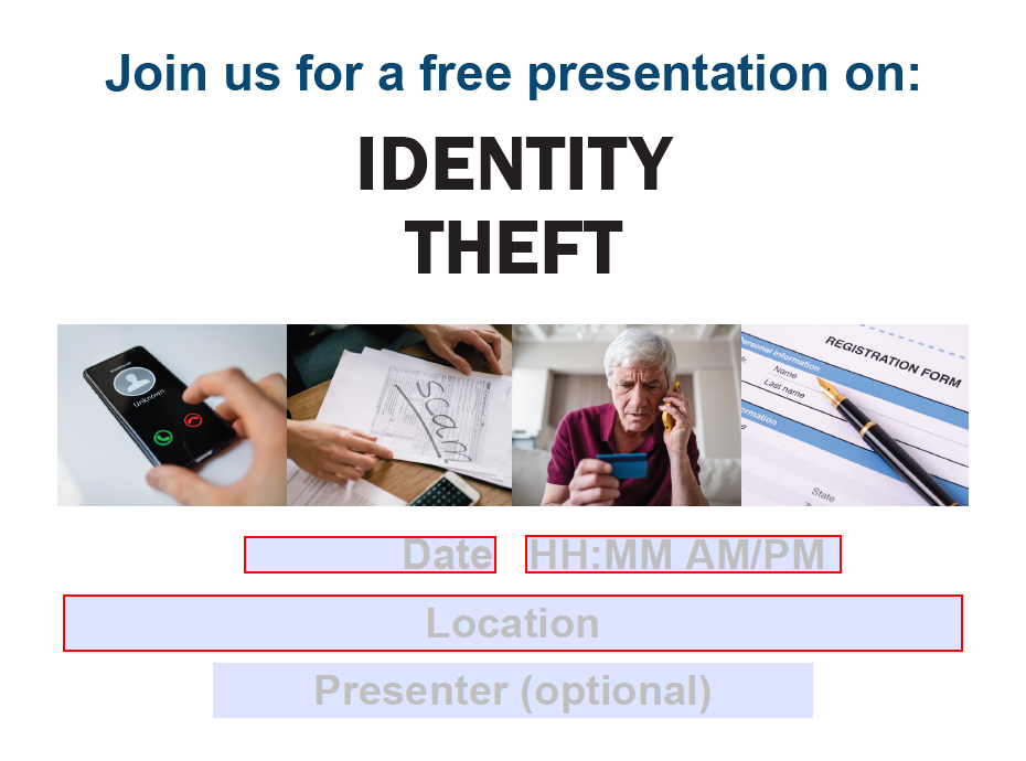Download a PDF slideshow and presenter guide that can be used to host your own presentation about Identity Theft. To promote your presentation, download and fill out the promotional poster, then print it or share it as a PDF.