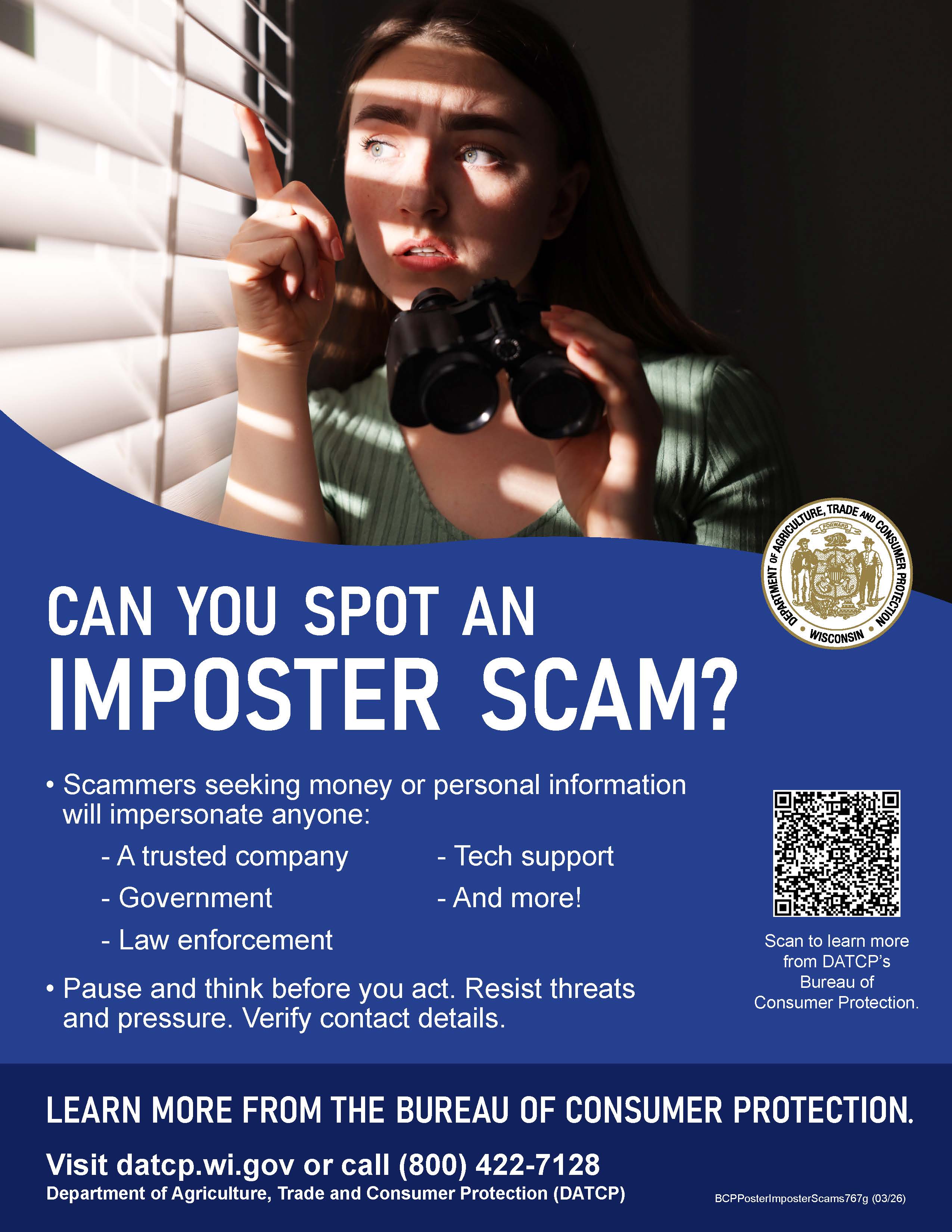 DATCP has also developed informative Public Service Announcements on several consumer protection issues. Open DATCP's Consumer Protection PSA YouTube playlist for PSA videos about common scams, imposters, fake websites, and more.